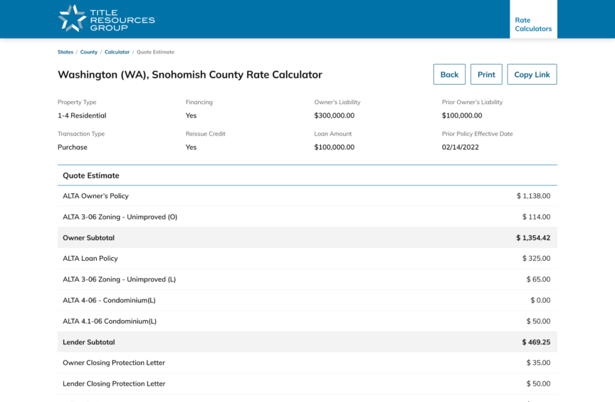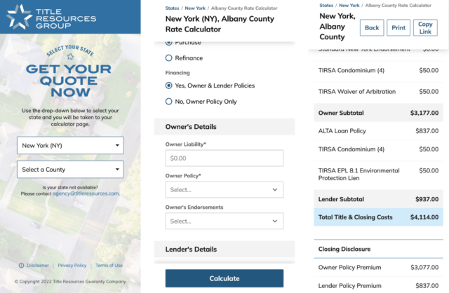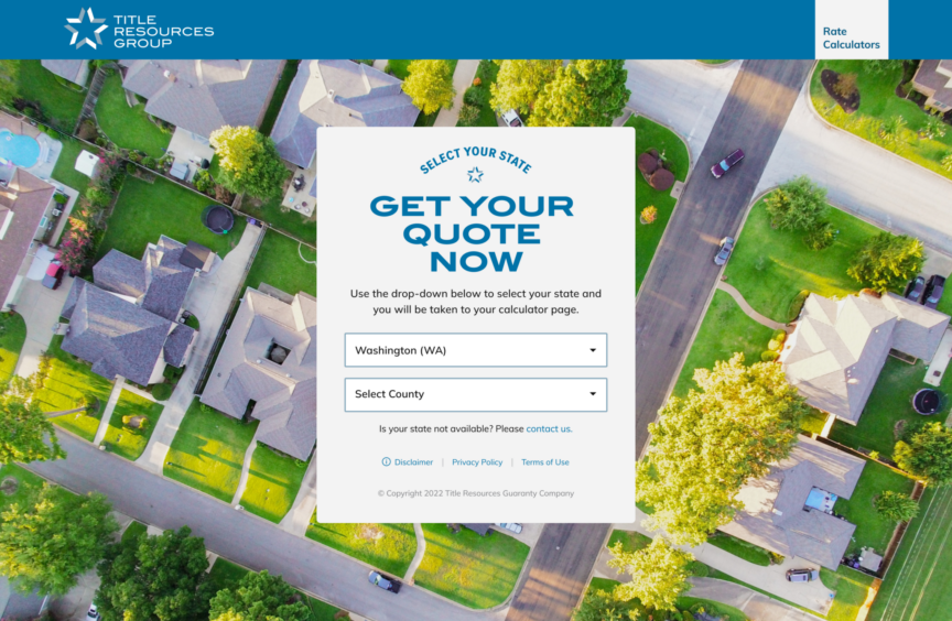 While title insurance is common to every real estate transaction, calculating the policy premium is a painstaking process. Title insurance rates are based on a sprawling set of complicated and nuanced calculations based on hundreds of variables, all of which can vary by state and county jurisdiction. Title Resource Group underwrites title insurance policies in 38+ states. So, when an agent is facilitating a purchase & sale or a refinance of a commercial or residential property, she gets a title insurance quote directly on her favorite underwriter’s website or through her title & escrow closing software.